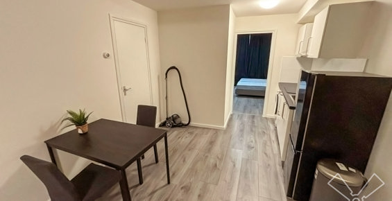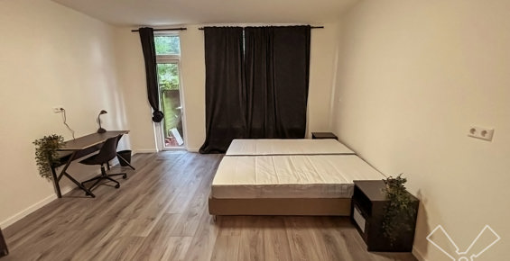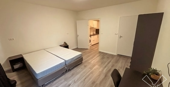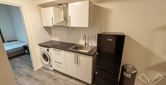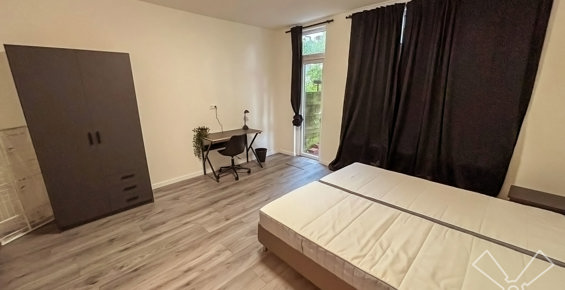 As you step inside, you'll find your spacious bedroom, thoughtfully furnished with essential amenities, including a desk, desk chair, bed with storage space, drawer, and wardrobe. The well-equipped kitchen features all the necessary appliances, including a refrigerator, stove, oven, sink, and extractor hood. There is also a shelf with ample space for your kitchen essentials. The bathroom comes complete with a refreshing shower, sink, and mirror, providing a private space to freshen up and start your day with ease. Additionally, there's a separate toilet, adding to your convenience.
