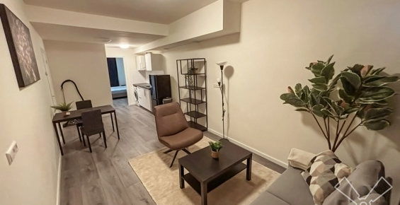 The apartment's heart lies in the generously sized living room, furnished with a large sofa, coffee table, and TV, creating a welcoming space to unwind and entertain guests. Adjacent to the living area, you'll find a separate room with a dining table, shelves, and a cupboard, perfect for enjoying meals or setting up a cozy study corner.